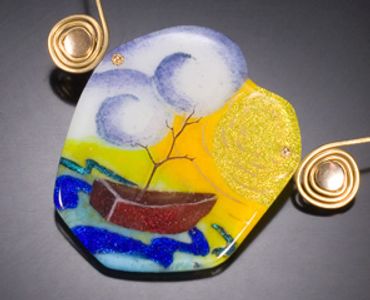 I am a glass artist who specializes in making items for personal adornment so naturally these artifacts are no exception. The triptych in its entirety can be displayed as a wall sculpture and individual panels can be mounted upon the neck torc for wearing. I was determined to incorporate at least one component from my father's personal estate and that manifests itself as the two retractable cuff link studs that hold the panel segments onto the metal neckpiece. Ultimately, that's what makes it possible to wear this story… his story…